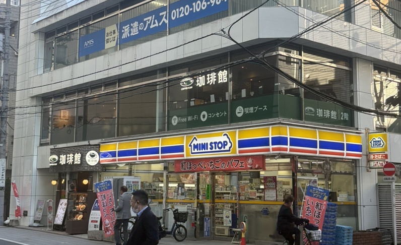 ミニストップの横に珈琲館があり、その横のビルの高橋ビル2階がチキンゴルフ調布店でございます。